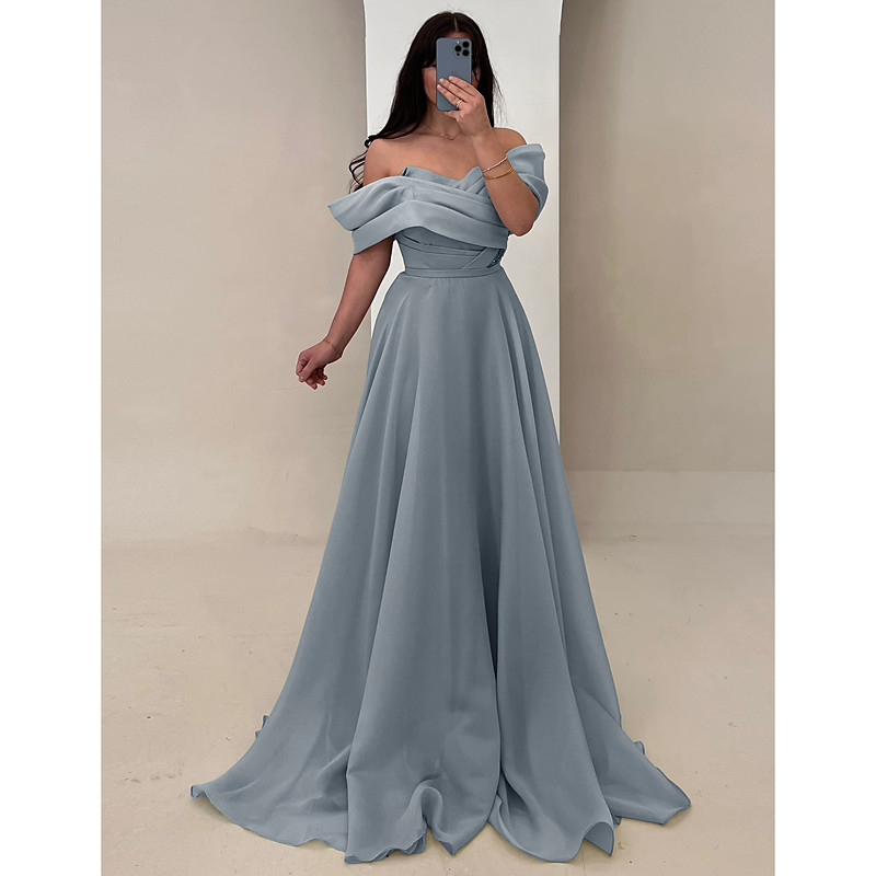 A-Line Floor Length Evening Gown Ball Gown Formal Dress Elegant Short Sleeve Off Shoulder Wedding Formal Champagne Mother Of the Bride Dress Satin with Glitter Pocket