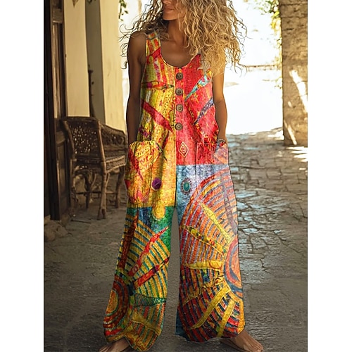Per donna Tuta Attivo Floreale Senza Maniche Senza maniche Gamba larga Collo a U Tasca Bottoni Quotidiano Vacanza Vestibilità comoda Arancione Estate