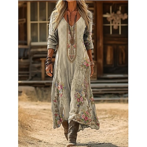 Per donna Abito maxi Vestito Estivo Abito Estivo Vacanza Casual Boho Quotidiano Vestibilità comoda Grafico Blocco di colori Etnico Manica Lunga Scollo a V Rosa Arancione Verde Arancione chiaro Estate