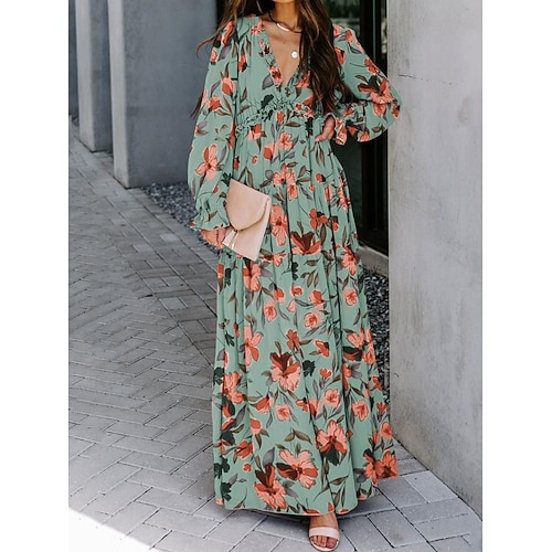 Per donna Abito lungo maxi Vestito in Chiffon Abito Floreale Abito Stampato Elegante Moda Moderno All'aperto Vacanza Data Vestibilità comoda Floreale Manica Lunga Scollo a V Giallo Blu Reale