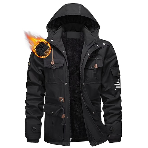 Herren US Flagge Fleecejacke Cargo-Jacke Windbreaker Thermowarm Lässig Militär Outdoor Campen und Wandern Bestickt Abnehmbare Kapuze Mit Kapuze Winter Stehkragen Langarm Schwarz Kaki Armeegrün