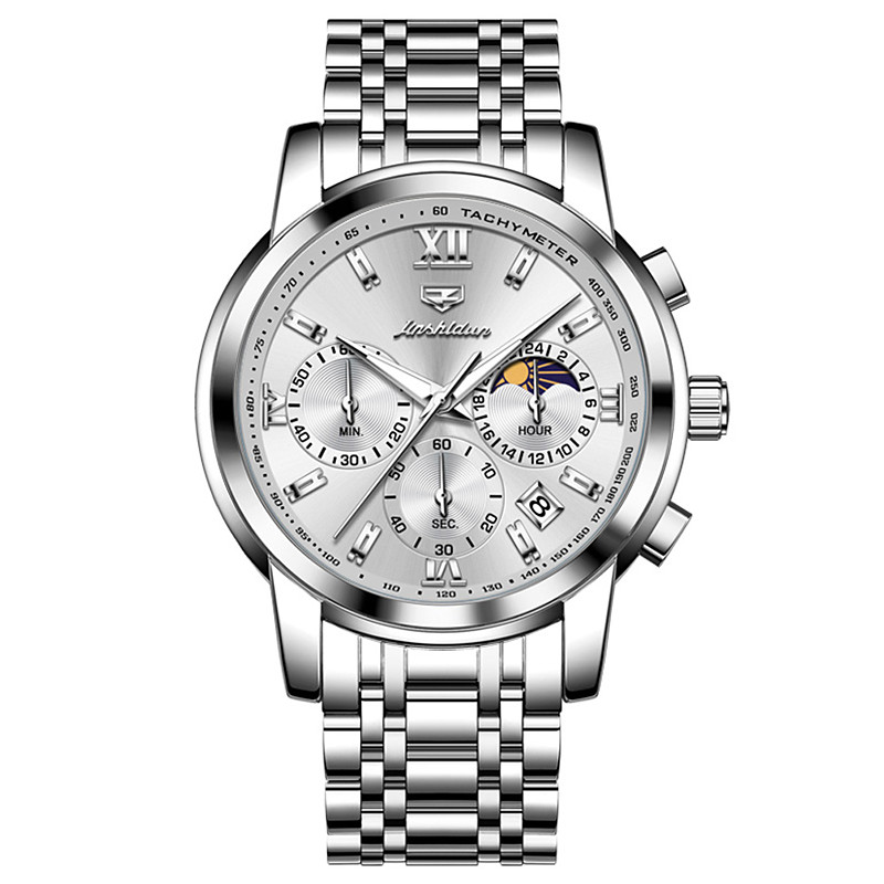 Fashion Quartz Watch Gift Round-dial Stainless Steel Watchband Wristwatch Moon Phase Calendar Luminous Small second Stainless Steel Strap Watch