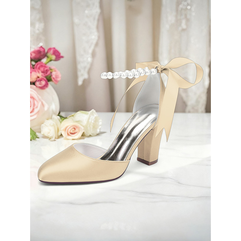 Women's Orange Satin Block Heel Pumps with Pearl Ribbon Ankle Strap - Elegant Pointed Toe High Heels for Weddings, Parties Evening Events