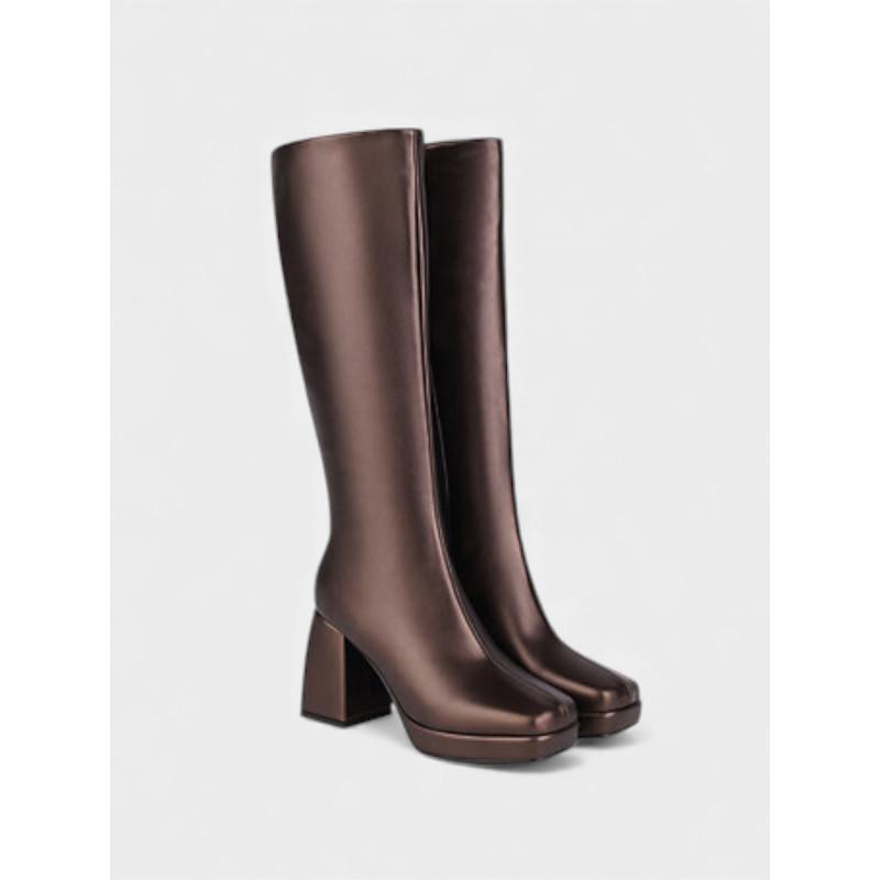 Women's Silver Metallic Knee-High Block Heel Boots – 1980s Disco Platform Go Go Boots with Zipper, Fashionable for Parties, Night Out and Special Events