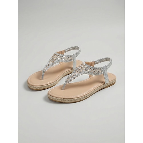 Glitzernde silberne Strass-Zehentrenner für Damen – elegante, flache Glitzer-Sandalen mit T-Riemen und elastischem Knöchelriemen für Strandurlaube und Hochzeiten am Meer Sommer-Kreuzfahrtkleidung