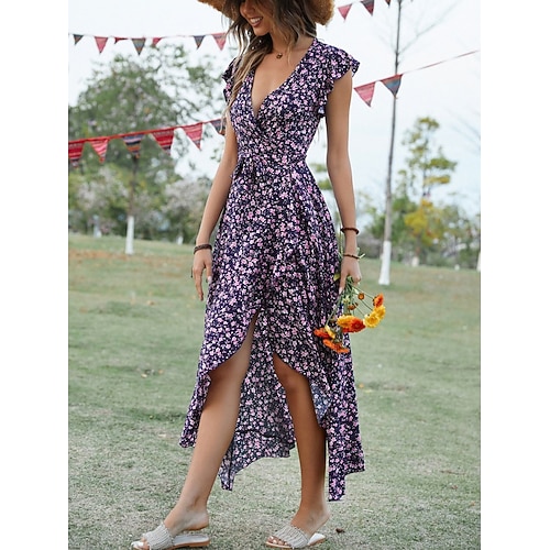 Per donna Abito Midi Abito Estivo Abito Pieghettato Vacanza Casual Spiaggia Quotidiano Ferie Vestibilità regolare Floreale Grafico Manica Corta Girocollo Blu Viola Verde Estate