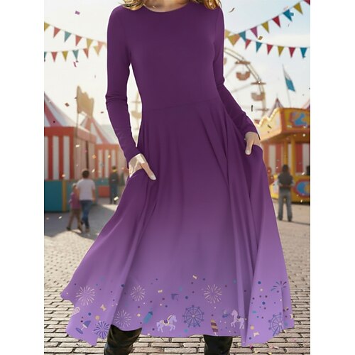 Per donna Abito Midi Vestito Casual Vestito a ruota Elegante Moda Quotidiano All'aperto Weekend Vestibilità regolare Floreale Grafico Manica Lunga Girocollo Blu Giallo Viola Verde Primavera Autunno
