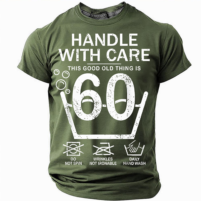 Mens Funny 60th Birthday Graphic Tee Handle With Care This Good Old Thing Is 60 Washing Instructions Humor Short Sleeve Lifestyle T-Shirt
