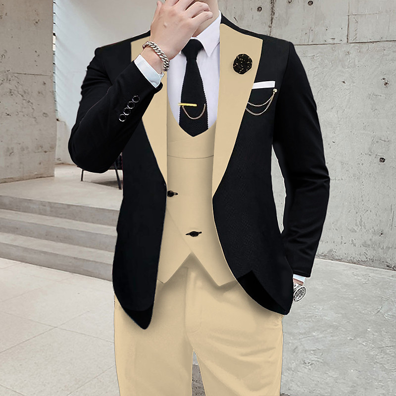 Men's Wedding Party Tweed Suits Peaked Lapel Black Coffee Daily Casual Solid Colored Tailored Fit 3 Piece Single Breasted Two-buttons