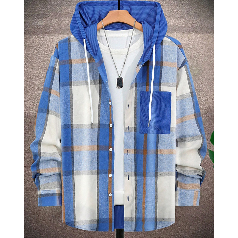 Men's Shacket Shirt Jacket Winter Jacket Plaid Vacation Daily Wear Black Red Blue Khaki Long Sleeve Hooded Fall Winter Clothing Apparel Drawstring