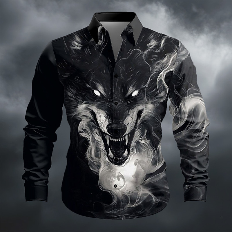 Men's Smoky Animal Wolf Shirt Button Up Shirt Long Sleeve Vintage Retro Outdoor Dailywear Spring Fall Turndown 3D Print Collared Shirts Black Brown