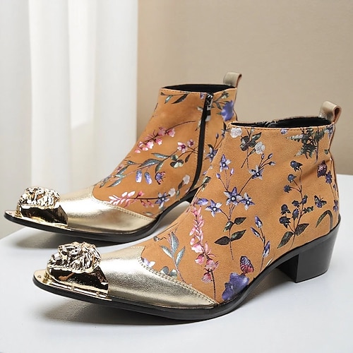 stivaletti chelsea da uomo in pelle verniciata con motivo floreale e dettagli dorati: calzature eleganti e alla moda per abiti da sera, feste ed eventi formali