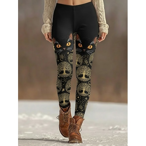 Damen-Leggings im Wikinger-Stil, kuschelig, für Urlaub, Vintage-Look, Ethno-Stil, lange Länge, hoher Bund, Katzenprint, bequem, dehnbar, für Freizeit, Streetwear, Freizeit, Schwarz, Gelb, Grün,