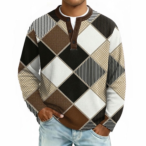 Per uomo Geometrico Plaid Blocco di colori Maglia Henley a nido d'ape Stile casual Stile classico Manica Lunga Moda Designer Grafica Casuale Quotidiano All'aperto Autunno Primavera Autunno Grigio