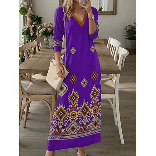 Per donna Abito maxi Abito a trapezio Casual Quotidiano Vestibilità comoda Floreale Manica Lunga Scollo a V Giallo Vino Rosso Blu Primavera Autunno