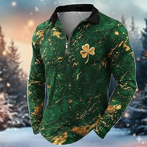 Giorno di San Patrizio Per uomo Trifoglio Marmo Polo Manica Lunga Collo ripiegato Moderno Tempo libero Ferie Casual Quotidiano Festival Cerniera Stampa 3D Primavera Autunno verde 1# Verde 2# Verde 3#
