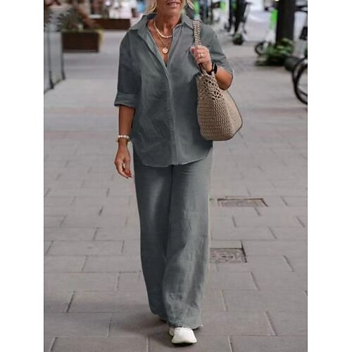 Per donna Set di Pantaloni Finto cotone e lino Manica Lunga Colletto a Camicia Tinta unica Semplice Elegante Moda Streetwear Casuale Quotidiano All'aperto Blu Nero Rosa Estate Vestibilità comoda