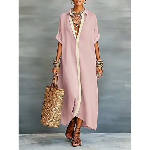 Per donna Abito maxi 100% cotone Abito a Tubino Abito Camicia Abito Bianco Casual Quotidiano Vacanza Vestibilità comoda Semplice Manica 3/4 Scollo a V Nero Bianco Rosa Blu marino Estate Primavera