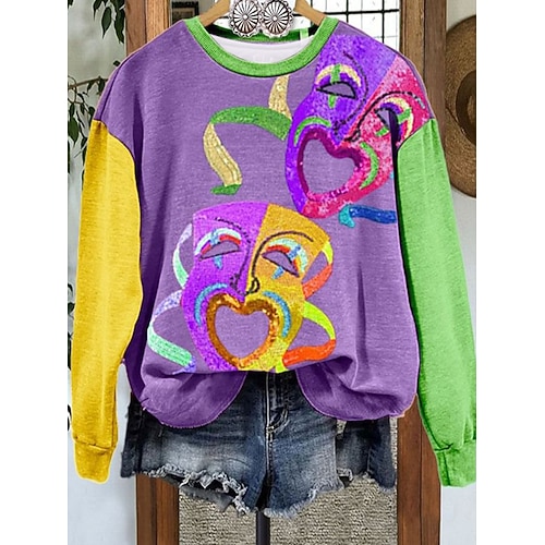 Felpa Pullover da Donna Carnival Maglietta Grafica Astratta Casual Maniche Lunghe Collo Giro Regular Tops Moda Quotidiana Giallo Viola Verde Primavera Inverno