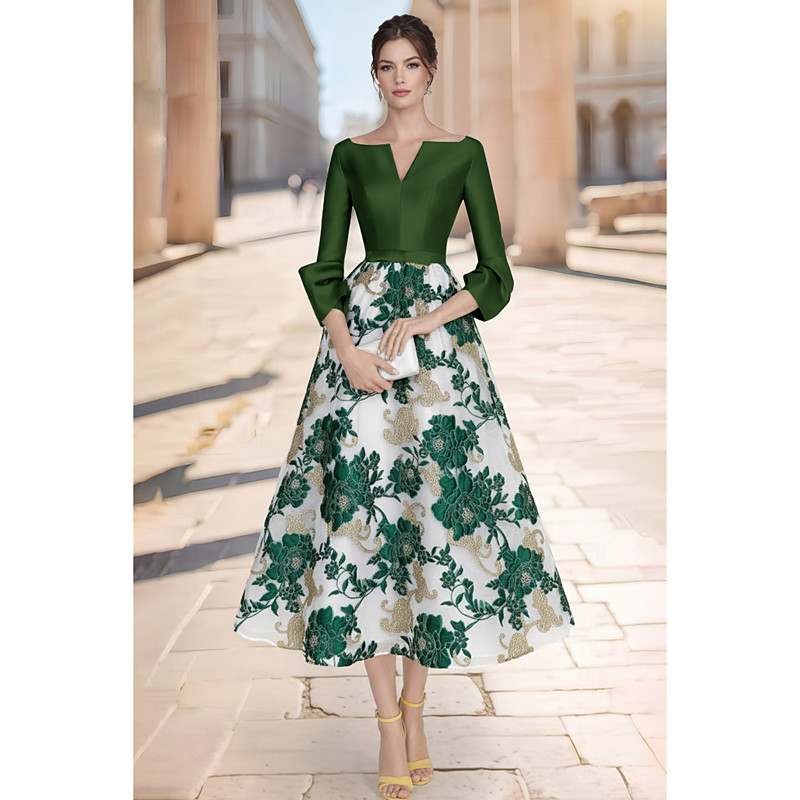 A-Line Tea Length Cocktail Dresses Elegant Vintage Floral 3/4 Length Sleeve V Neck Garden Party Wedding Pocket Satin Jacquard with Floral Print Pleats Pocket