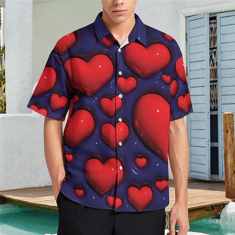 Valentine's Day Heart Casual Men's Shirt Daily Wear Going out Weekend Summer Turndown Short Sleeves Red, Navy Blue, Khaki S, M, L 4-Way Stretch Fabric Shirt