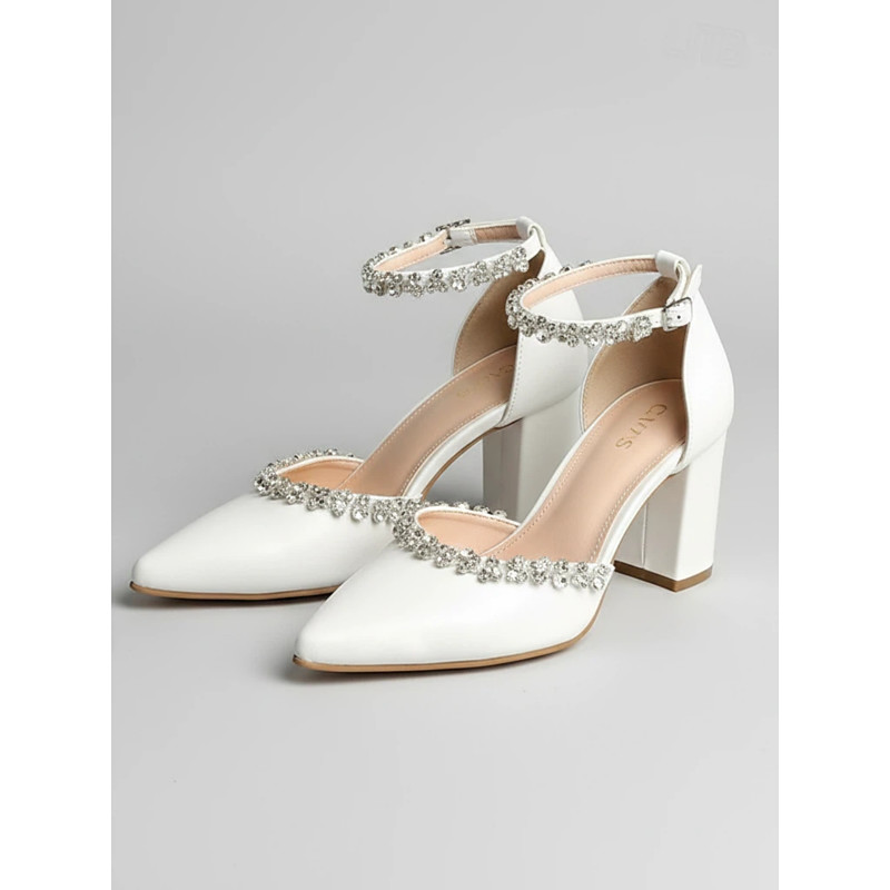 Women's White Block Heel Wedding Shoes – Pointed Toe with Rhinestone Embellished Ankle Straps, Elegant Bridal Footwear for Special Occasions