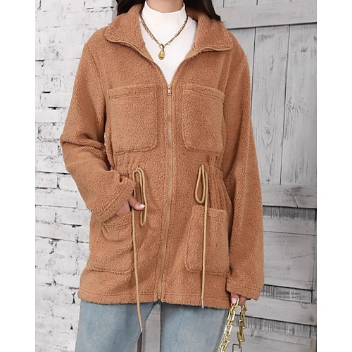 Per donna Cappotto Invernale Cappotto Teddy Caldo Confortevole Cerniera Tasca Casual Tinta unica Natale Vacanza Streetwear Casuale Regolare Collo ripiegato Vestibilità regolare Manica Lunga Capispalla