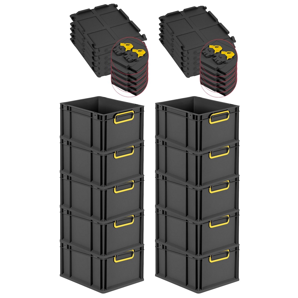PROREGAL SuperSparSet 10x Eurobox NextGen Color mit Scharnierdeckel & Verschlüssen, HxBxT 22x30x40cm, 20L, Schwarz, Griffe gelb zu, Eurobehälter