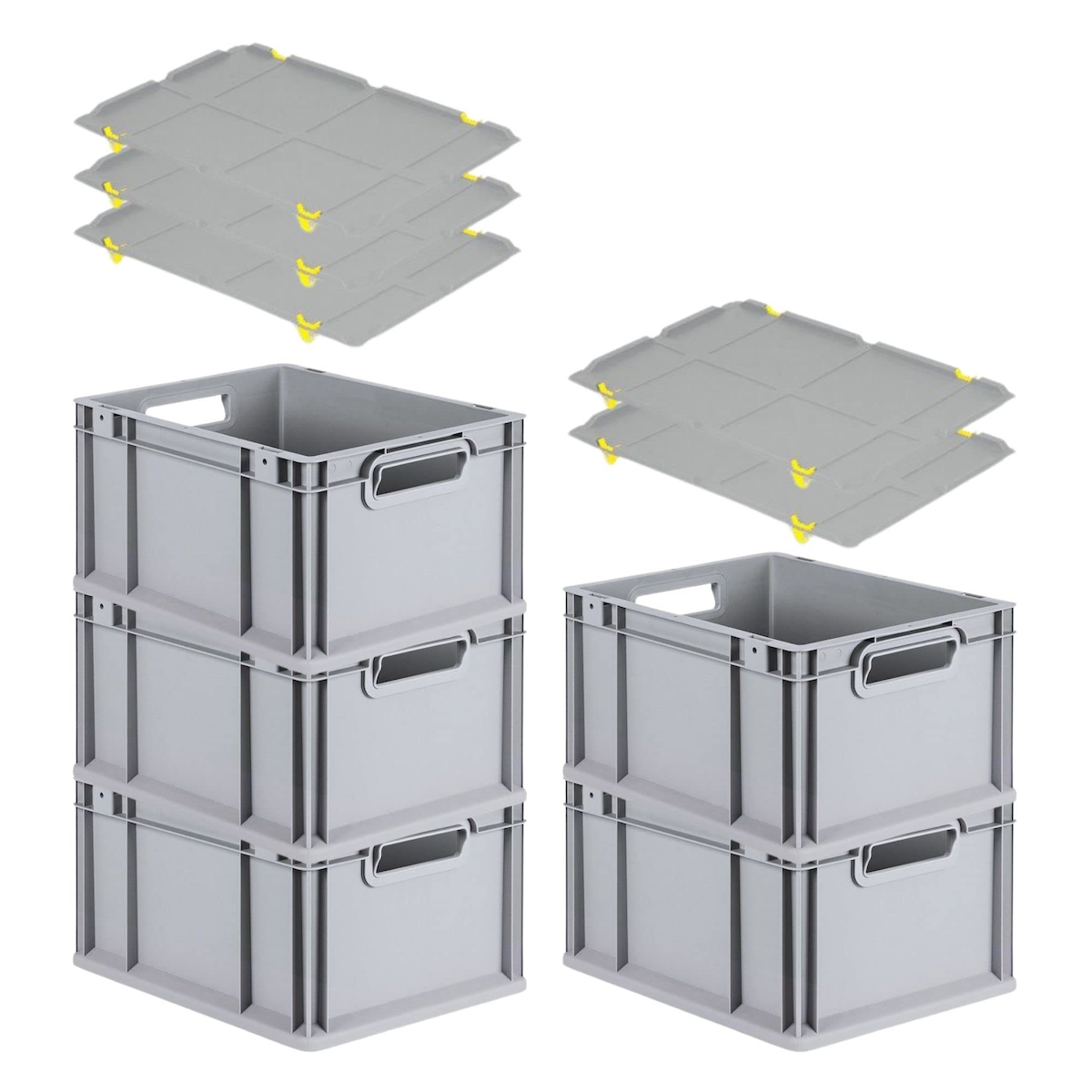 PROREGAL SparSet 5x Eurobox NextGen Grip mit Auflagedeckel & 4 gelben Verschlüssen, HxBxT 22x30x40cm, 20L, Grau, Griffe offen, Eurobehälter
