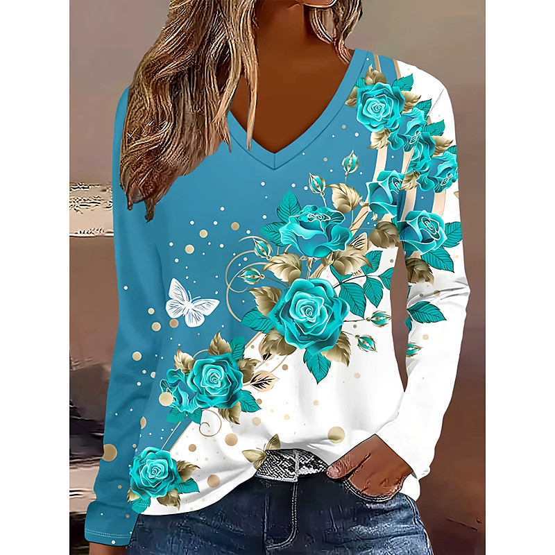 Women's T Shirt Graphic Plants Vintage Stylish Classic Long Sleeve V Neck Regular Tops Daily Print Blue Spring Fall Winter