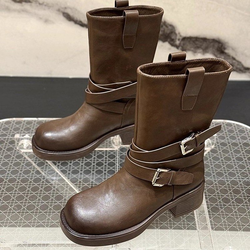 Men's Genuine Faux Leather Harness Mid-Calf Boots – Vintage Motorcycle Riding Style Western Biker Boots for Outdoor and Casual Wear