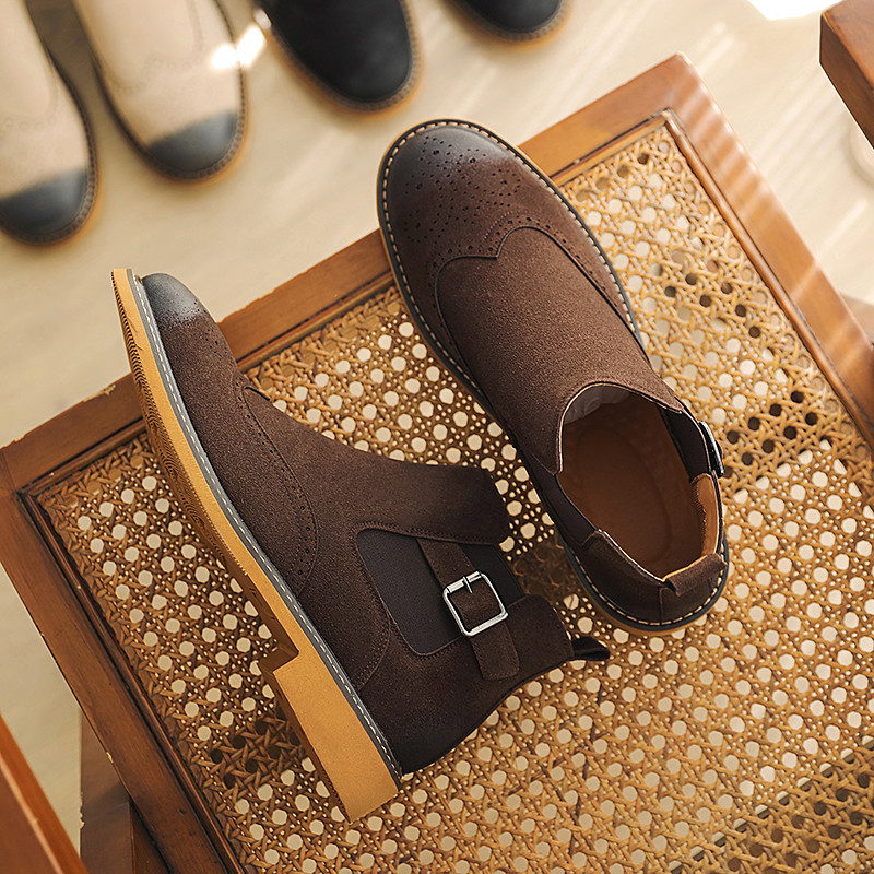 Men's Beige Faux Leather Ankle Boots – Stylish Buckle Design with Brogue Detailing, Ideal for Smart Casual Wear, Office and Everyday Outings