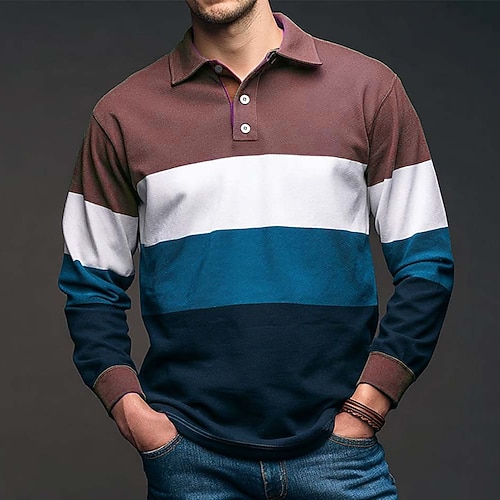 Per uomo Strisce orizzontali Polo da rugby Manica Lunga Magliette polo Camicie con Colletto Abbigliamento Sportivo Casual All'aperto Scuola Athleisure Stampa 3D Bottoni Primavera Autunno Blu Marrone