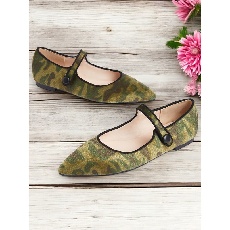 Women's Camo Print Mary Jane Flats – Faux Pony Hair Material, Pointed Toe Comfortable Slip-On Shoes with Soft Sole, Ideal for Casual Wear, Outdoor Activities, and Everyday Style