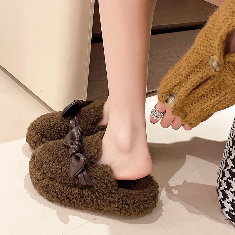 Warm Thick Sole Cotton Slippers with Bow Plush Closed Toe Slippers for Women Indoor Outdoor Furry Slip On Shoes with Extra Fleece