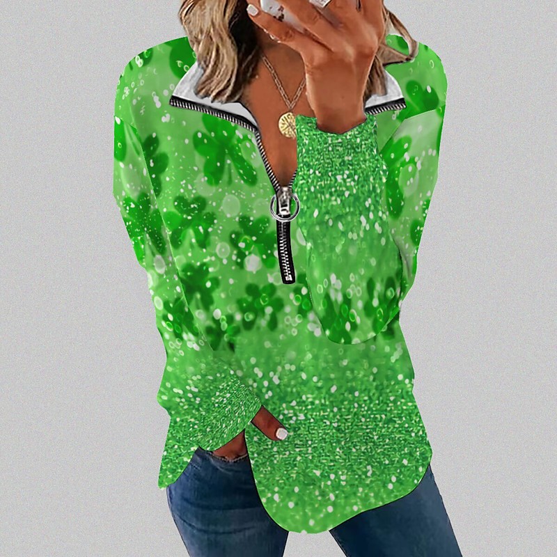St. Paddy's Day St. Patrick's Day Women's T Shirt Leaf St. Patrick's Day Basic Long Sleeve V Neck Regular Tops Casual Holiday Print Quarter Zip Grass Green White Yellow Light Green Army Green Fall