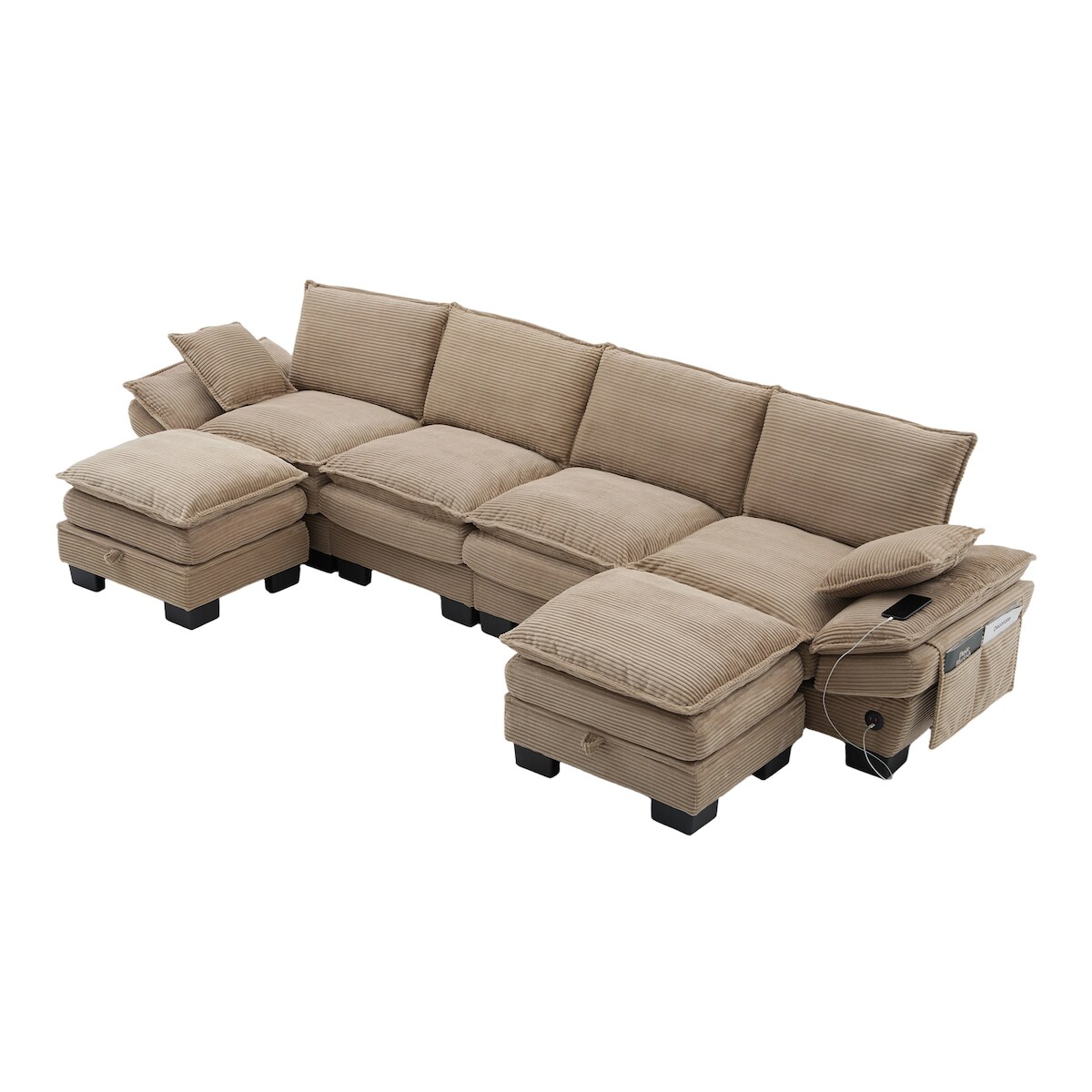 Merax 4-Sitzer-Sofa mit 2x Hocker, USB-C-Anschluss & Seitentaschen, Dicke Kissen, Corduroy, Khaki