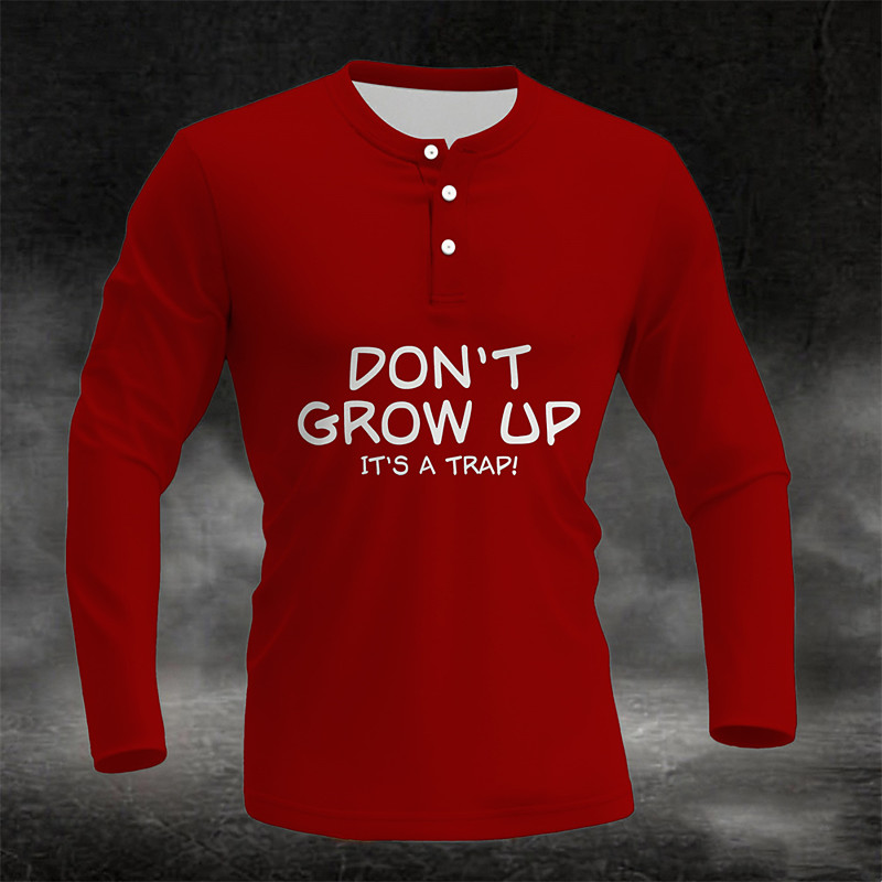 Men's Long Sleeve Henley T-Shirt - Don't Grow Up It's a Trap! White Humorous Lifestyle Graphic
