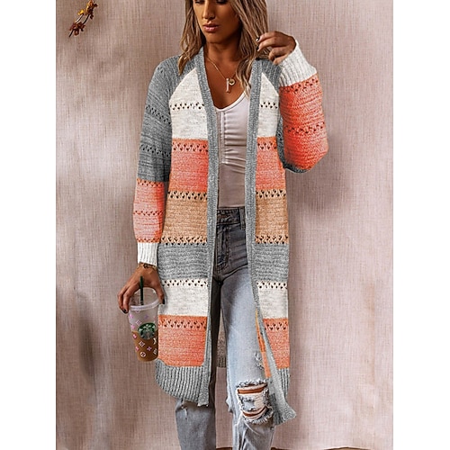 Damen Pullover Strickjacke Elegant Mode Streetwear Gestreift Öffnung vorne Tasche Gestrickt Langarm Lange Oberteile Stricken Outdoor Täglich Wochenende Schwarz Wein Frühling Herbst