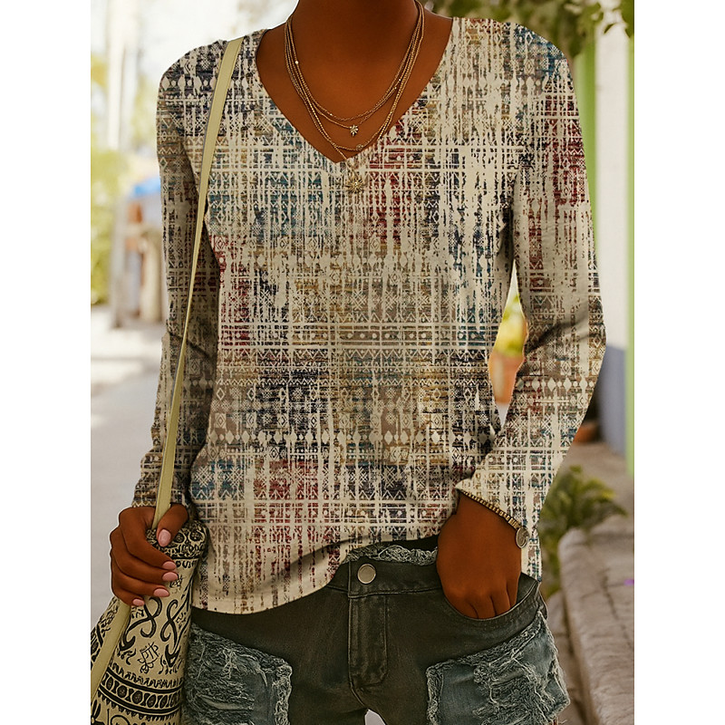 Women's T Shirt Bohemia Vintage Casual Long Sleeve V Neck Regular Tops Daily Maroon Pink Dusty Blue Khaki Spring Fall
