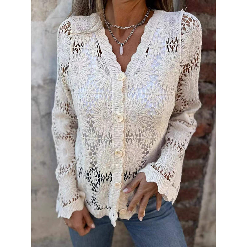 Women's Blouse Solid Color Stylish Casual Long Sleeve V Neck Regular Tops Daily Lace Patchwork Black White Beige Summer Spring