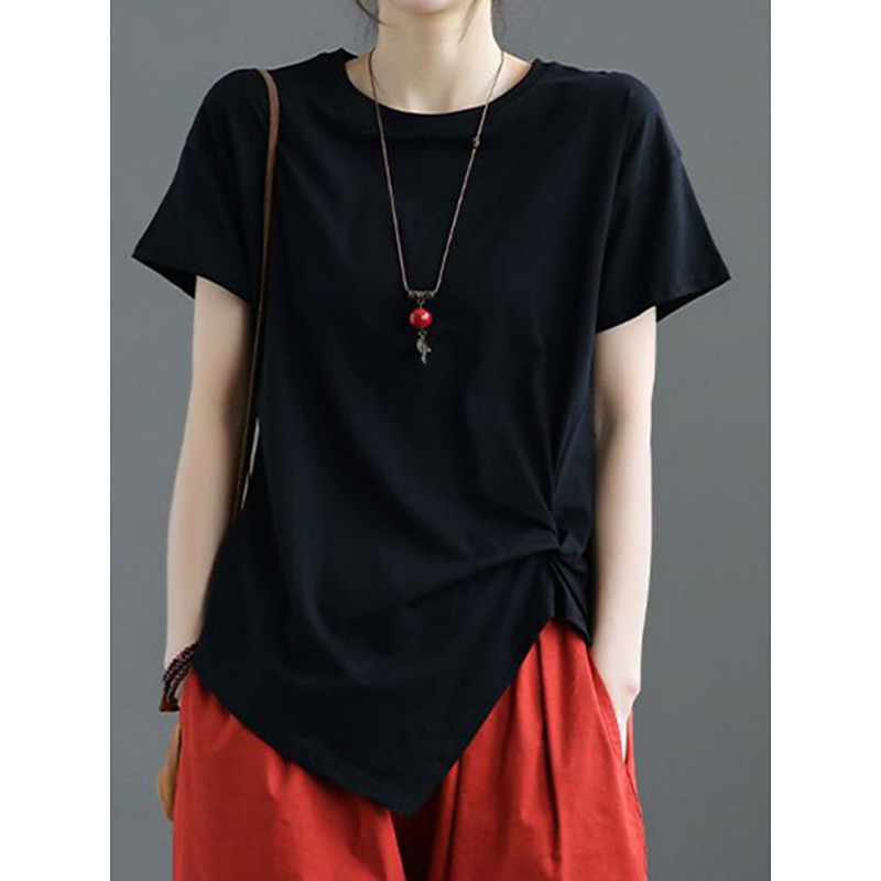 Women's T Shirt Solid Color Fashion Stylish Classic Short Sleeve Crew Neck Regular Tops Daily Weekend Ruched Black White Khaki Summer Spring