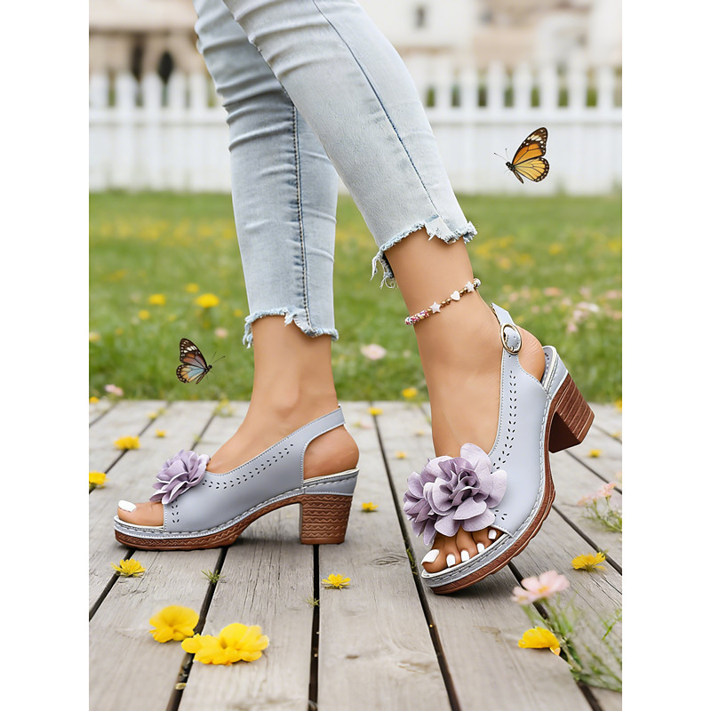 Women's Gray Flower Decor Mid Heel Sandals – Elegant Casual Style, Comfortable Block Heel for Ladies, Daily Wear, Garden Parties, Travel Summer Events