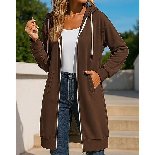 Per donna Felpa con zip Felpa con cappuccio lunga Coulisse con tasche Manica Lunga Top Athleisure Autunno Tinta unita All'aperto Viaggio Sportivo abbigliamento sportivo Abbigliamento sportivo Nero
