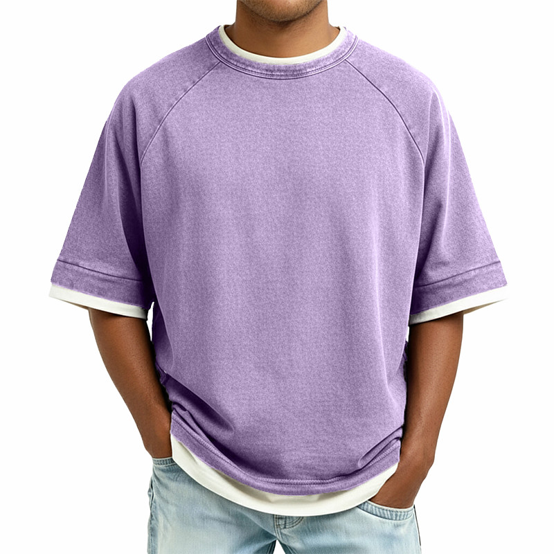 Men's 100% Cotton Acid Wash Shirt Short Sleeve Crew Neck Summer Spring Plain Retro Vintage Casual Vintage Style Fake two piece Washed Casual Blue Purple Green Top Tee for Men