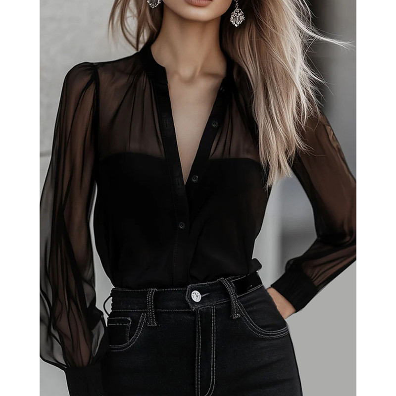 Women's Shirt Elegant Satin Blouse Plain Stylish Long Sleeve V Neck Regular Tops Daily Holiday Going out Patchwork Mesh Black Summer Spring