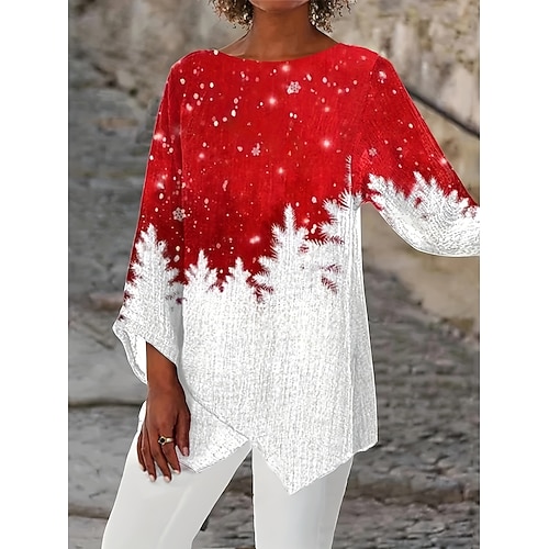 Weihnachten Damen Bluse Grafik Vintage Tropisch Stilvoll 3/4 Ärmel Crew Neck Boot Ausschnitt Reguläre Oberteile Täglicher Feiertagsdruck Rot Frühling Herbst Winter