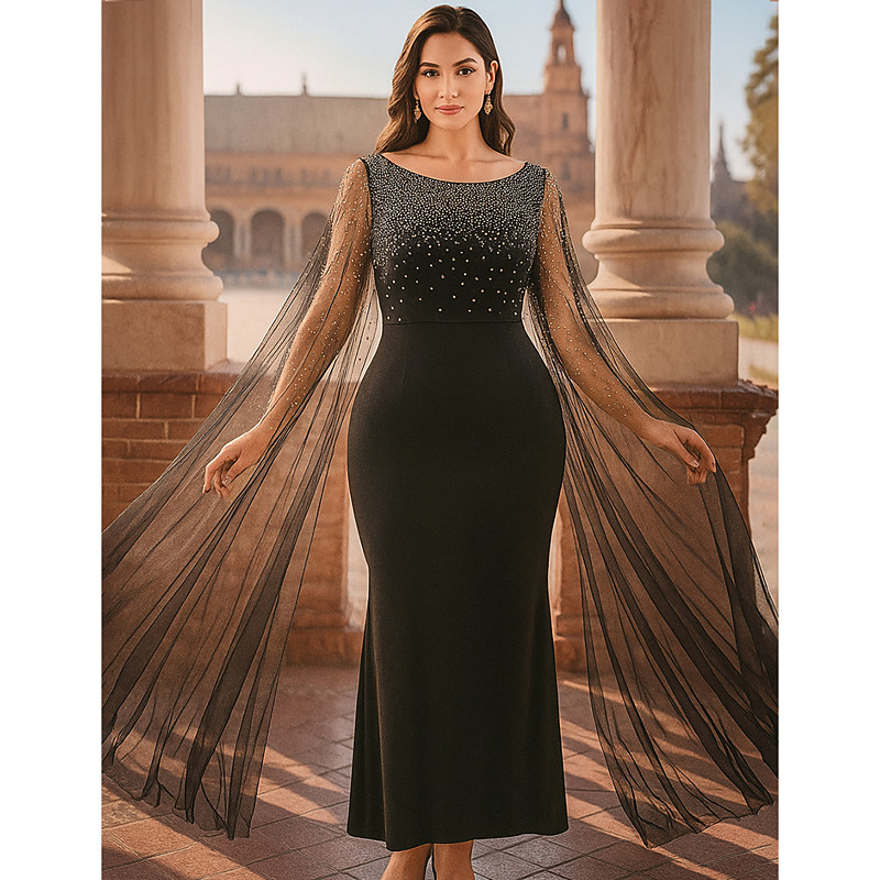 Sheath Column Floor Length Black Dress Wedding Guest Dress Formal Dresses Mother of the Bride Dress Long Sleeve Crew Neck Elegant Vintage Party Formal Spandex Tulle with Beading