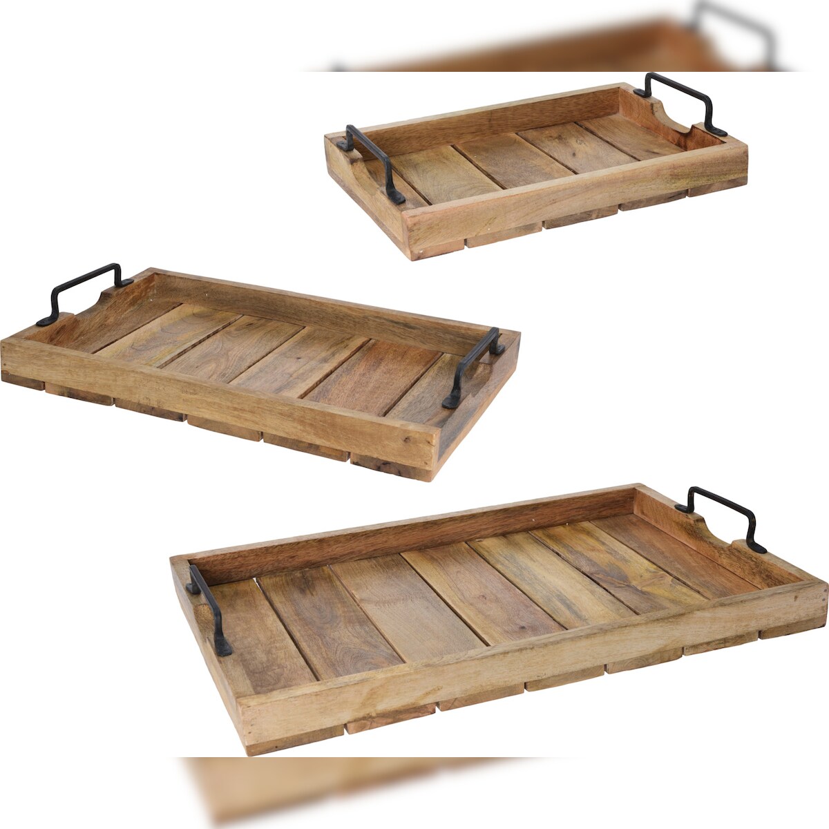 Tablett Holz Frühstück Tablett Serviertablett Vintage Metallgriff 3tlg Set A510
