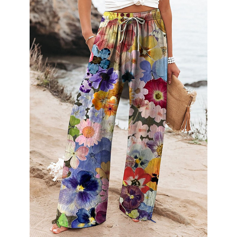 Women's Wide Leg Baggy Pants Beach Shorts Vacation Vintage Fashion Full Length High Waist Graphic Flower / Floral Drawstring Printing Soft Breathable Micro-elastic Vacation Causal Casual White Blue